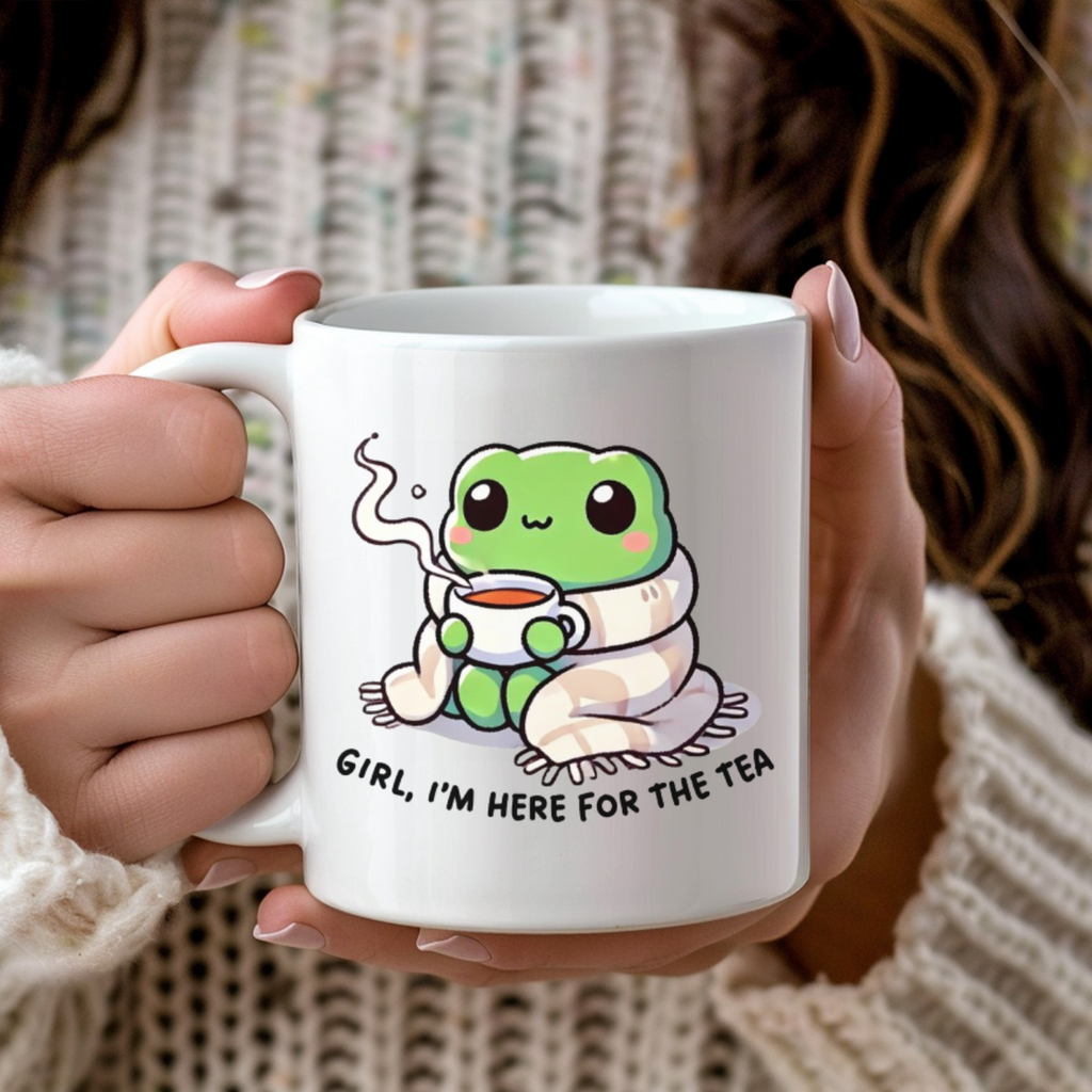 Brighten your day with this adorable “Here for the Tea” mug, featuring a cozy frog wrapped in a blanket and holding a steaming cup of tea. Perfect for tea lovers, gossip sessions, or simply enjoying your favourite hot beverage in style. This charming design makes an ideal gift for friends, family, or anyone who loves a touch of cuteness with their tea time.